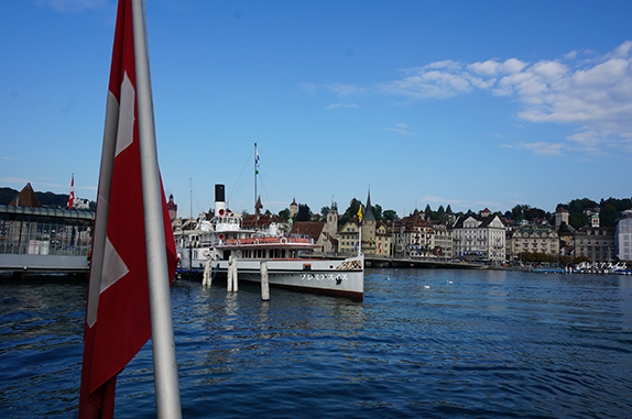 ルツェルンの町から湖船に乗って魔の山ピラトゥス山や湖畔の美しい景色を見ながらリギ山に向かいます。フィッツナウに到着後、ヨーロッパ最古の登山電車に乗り換えて、リギ山頂へ。山頂からは、眼下に登山電車と牧草地、その向こうの湖の遥か背後には、白銀の頂が連なるスイスアルプスが左右に広がっています。
